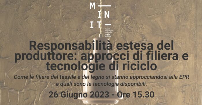 Si terrà il 26 Giugno l’evento online Responsabilità Estesa del Produttore: Approcci di Filiera e Tecnologie di Riciclo, dedicato alle EPR e al modo in cui le filiere del legno e del tessile si stanno approcciando a esse e attraverso quali tecnologie di loro disponibilità. Programma Introduzione Roberto Vannucci – Cluster MinIt Interventi Pasquale Campanile…