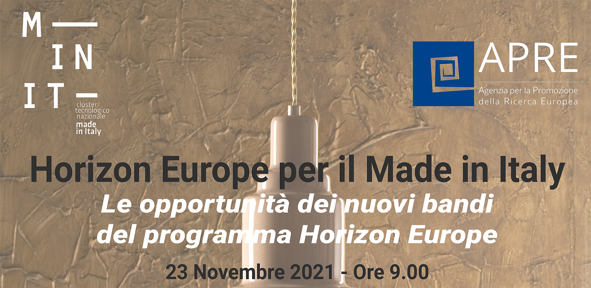 Il 23 novembre il Cluster MinIt e APRE – Agenzia per la Promozione della Ricerca Europea organizzano “Horizon Europe per il Made in Italy – Le opportunità dei nuovi bandi del programma Horizon Europe”, evento online dedicato alle opportunità date dai nuovi bandi del programma Horizon Europe per le filiere del Made in Italy.